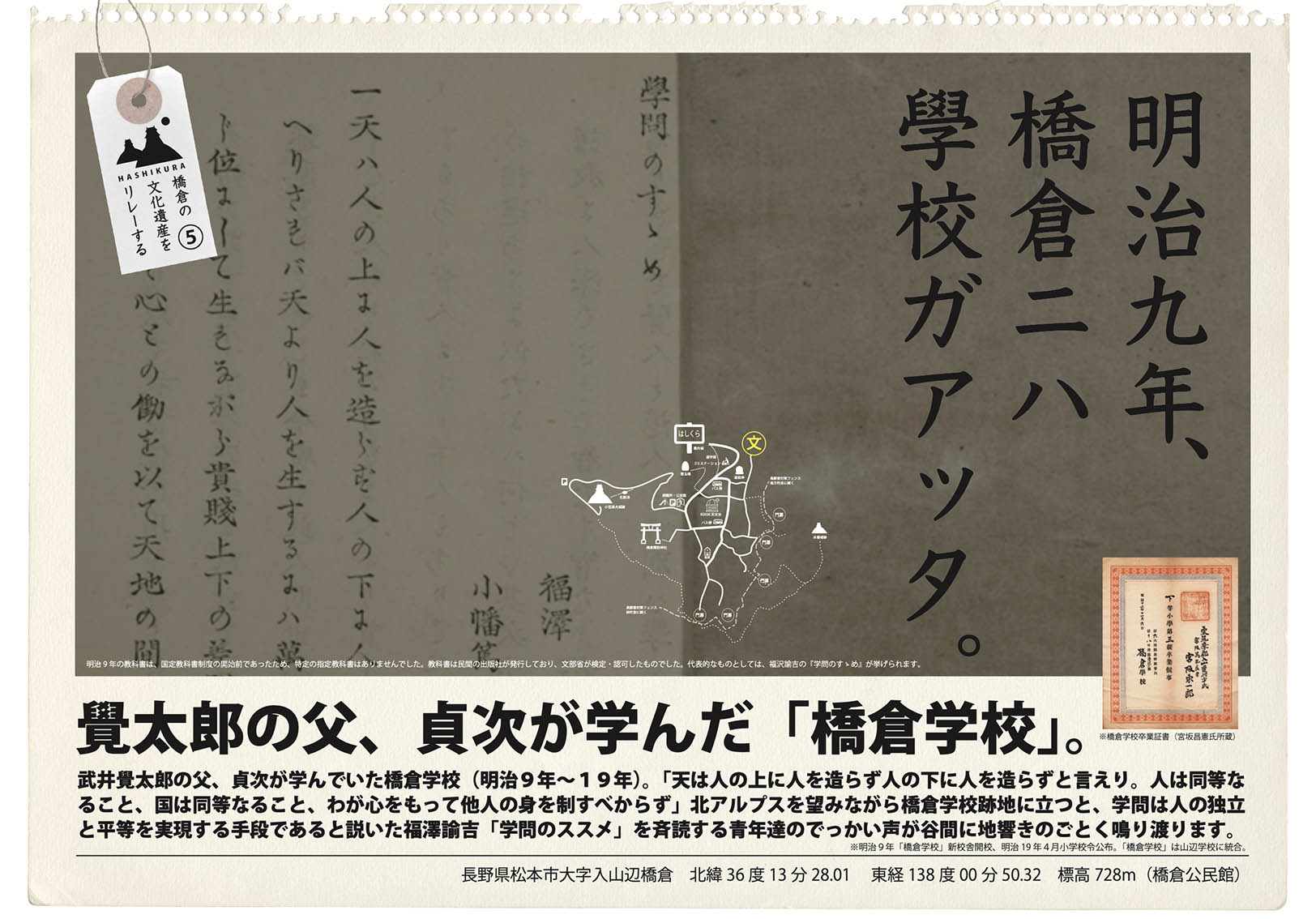 * 明治9年8月 筑摩県が廃止され信濃全域長野県管轄となる。県下一円第6大学区に入り、橋倉学校は第18番中学区第6番小学となる。
